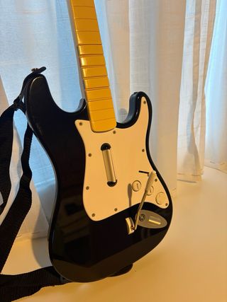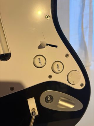 Guitarra para Rock Band, modelo Fender Stratocaster. La guitarra esteticamente esta perfecta. *Pros: Funciona y se enciende. *Contras: La púa central cuando le das hacia abajo hay algunas veces que no pulsa la nota, y hacia arriba no va. *Detalle: De los dos botones que tiene, en vez de ser ( Select y Start ), los dos pone "Select", es raro pero viene asi. - No incluye receptor Usb - Color negro y blanco. - Incluye correa. - Compatible con PlayStation 3 Cualquier manitas seguro que la puede arreglar