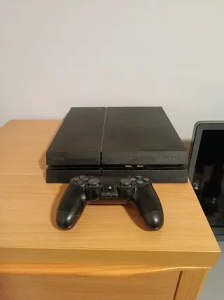 Consola de videojuegos PlayStation 4 en color negro, junto con su mando. - Diseño elegante y compacto. - Incluye un mando DualShock 4.