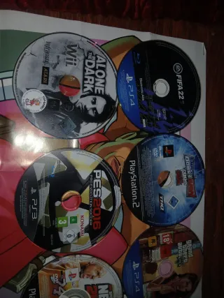 Lote de videojuegos para diversas consolas. - Incluye juegos para PlayStation 2, PlayStation 3, PlayStation 4, y Nintendo Wii. - También se incluyen discos UMD para PSP. - Títulos visibles: Alone in the Dark (Wii), PES 2016 (PS3), FIFA 22 (PS4), Grand Theft Auto (PS2), NBA (PS2), The Sims (PC). - Algunos juegos vienen con su cartilla/cartel