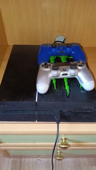 Consola PlayStation 4 en color negro, acompañada de dos mandos, uno azul y otro plateado. Incluye un cable de carga. - Consola PlayStation 4. - Mando de color azul. - Mando de color plateado. - Cable de carga. Cambio PlayStation 4 más doy dinero a favor por PlayStation 5 zona coruña no envío solo TRATO EN MANO EN CORUÑA
