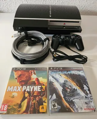 Consola PlayStation 3 ( PS3 ). Incluye: - Consola FAT 80 GB. Firmware 4.91. - Mando DualShock PS3 original y nuevo. - Cable mando PS3. - Cable alimentación. - Cable HDMI de alta calidad. - Juego Metal Gear Rising. - Juego Max Payne 3. Funciona todo bien. Las fotos son actuales. También se puede vender por separado. - Consola y cables: 50 euros. - Mando y cable: 18 euros. - Juego Metal Gear Rising: 15 euros. - Juego Max Payne 3: 8 euros. Precio no negociable. No hago envíos. No respondo a otras ofertas.