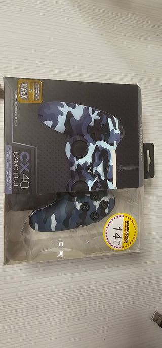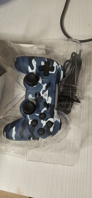 Mando de control con diseño de camuflaje, compatible con PS4 y PC a través de conexión USB. - Diseño de camuflaje azul y blanco. - Conexión por cable USB. - Botones frontales: Círculo, Equis, Cuadrado, Triángulo. - Botones superiores: L1, L2, R1, R2. - Sticks analógicos. - Cruceta direccional.