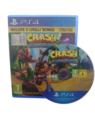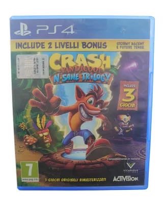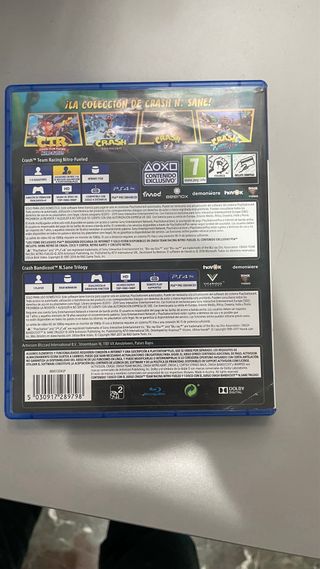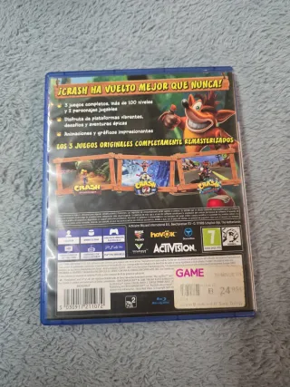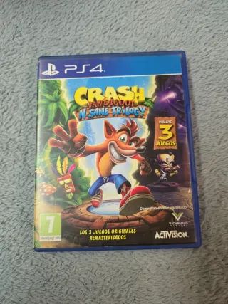 Juego Crash Bandicoot N. Sane Trilogy para PS4. - Incluye 3 juegos originales remasterizados. - Clasificación por edad: 7 años. Todo el contenido de los productos mostrados en las fotos. Para cualquier consulta estamos en la calle Santa Caterina, 2 San Adrian del Besós. Tlf: 934627635. Nuestro horario es: 10h a 14h y de 17h a 20:30h de lunes a Viernes. Sábados de 10h a 13:30h y de 17h a 20h. Todos nuestros productos están probados y cuentan con un año de garantía.