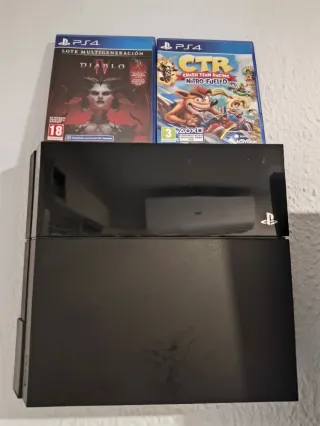 Consola PlayStation 4 en color negro, junto con dos videojuegos,. - Juegos incluidos: Diablo y Crash Team Racing. - Incluye dos mandos (uno azul y dos negros). - Soporte para colgar la consola. -Detalles a tener en cuenta: – A veces el ventilador suena fuerte (algo común en este modelo). – En ocasiones también emite unos pitidos breves, pero no afecta al funcionamiento: la consola no se apaga, no da errores y se puede jugar sin problema, yo nunca tuve ningún problema, simplemente la quiero vender por qué me compré la 5. Perfecta para quien busca una consola funcional a buen precio.