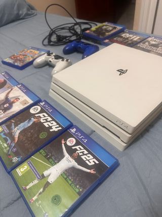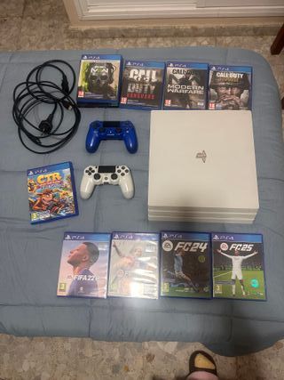 Consola PlayStation 4 Pro en color blanco, con 2 mandos y varios juegos. - Incluye dos mandos: uno blanco y uno azul. - Juegos incluidos: FC 24, FC 25, Call of Duty: Modern Warfare y Crash Bandicoot. - Cables de conexión.