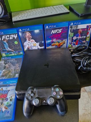 Consola PlayStation 4 en color negro, lista para horas de entretenimiento. Incluye cuatro videojuegos. - Juegos incluidos: FIFA 18, NFS Heat, FIFA 21, Assassin's Creed Mirage, y Cyberpunk 2077. - Mando DualShock 4 incluido. Incluye cables.