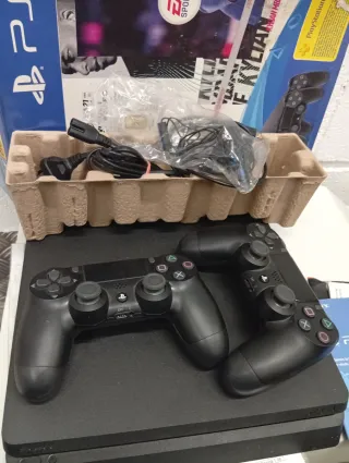 Consola PlayStation 4 slim en color negro, ideal para tus sesiones de juego. Incluye dos mandos para que puedas jugar con amigos o familiares. Funciona perfectamente como si estuviera nueva - Consola (500Gb) - Dos mandos Dualshock 4 originales - Dos juegos - Todos los cables originales - Caja original incluida - 2 juegos de Regalo Fifa 20 i 2k18 - Regalo 4 pares protectores de joyatics i una funda para mando