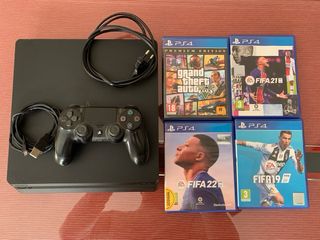 Play 4 slim 500 gb con muy poco uso y en perfecto estado + juegos (Fifas 19, 21 y 22 y GTA 5) SIN CAJA, con mando y cable de carga del mando, envio video de como funciona perfectamente