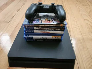 PlayStation 4 en muy buen estado, funcionando perfectamente. Incluye un mando original DualShock 4 y 5 juegos en físico: GTA V Dying Light Enhanced Edition The Division Call of Cthulhu Uncharted 4