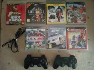 Lote de videojuegos y accesorios para PlayStation 3. - Incluye 7 juegos: Red Dead Redemption, Battlefield 3, Battlefield Bad Company 2, Virtua Tennis 4, PES 2010, Need for Speed Shift, The Amazing Spider-Man, - Dos mandos DualShock de control. - Cable de carga para mandos sony.