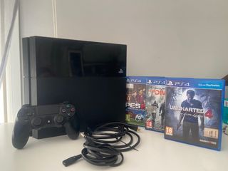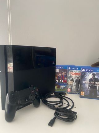 Consola PlayStation 4 en buen estado. - Modelo: PlayStation 4 - Color: Negro - Dimensiones: 12 pulgadas de ancho, 2 de grosor, 10.75 de profundidad - Peso: 2,8kg - Mando oficial : DualSchock - Almacenamiento: 500GB - Rendimiento: Tarjeta gráfica AMD Radeon con 8GB de memoria - Audio: Sonido 3D posible con auriculares playstation platinum - Conectividad: 1 puerto Ethernet, 2 puertos USB3, 1 puerto de salida HDMI, 1 salida AUX, Bluetooth 4