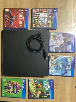 Play cuatro con el juego de Spider-Man, FIFA 22, también contiene el FIFA 21 los Sims cuatro el Ratchet Clank Horizon. Contiene dos mando nuevos y con sus fundas protectoras y el cargador, la play es del año pasado y esta nueva se ha usado muy poco, la vendo porque ya no le doy utilidad y al estar nueva le peude dad alguien un mejor uso. Aun conservo la caja original.