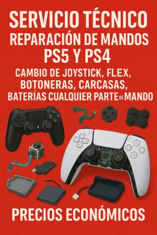 Servicio técnico especializado en la reparación de mandos de PlayStation 5 y PlayStation 4. Solucionamos todo tipo de averías para que vuelvas a disfrutar de tus juegos. - Cambio de joystick. - Reparación de flex. - Sustitución de botoneras. - Arreglo de carcasas. - Reemplazo de baterías. - Reparación de cualquier otra parte del mando. - Precios económicos.
