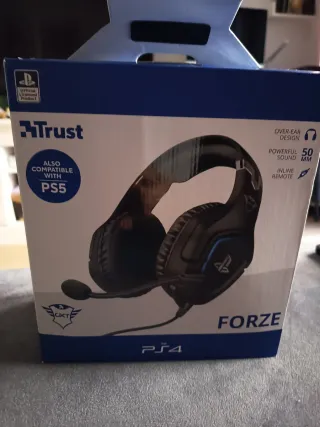 Auriculares de diadema de la marca Trust, modelo FORZE. - Diseño over-ear. - Sonido potente. - Mando a distancia en línea. - Compatible con PS4 y PS5. Nuevo. En su caja, sin estrenar.