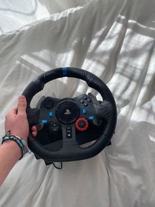 Volante de carreras Logitech G29. - Diseño en cuero. - Banda azul en la parte superior. - Botones de control integrados.