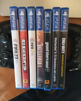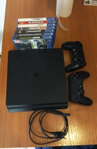 Consola PlayStation 4 en color negro, con dos mandos y siete videojuegos. Es la versión slim, que es mejor q la normal.. Juegos incluidos: FIFA 23 (dentro, sin la caja, hay también el Fifa 21 y el 22), Red Dead Redemption, Battlefield 1, Grand Theft Auto V, Uncharted 4: El Desenlace del Ladrón, Call of Duty: Advanced Warfare, Call of Duty: Ghosts. *Precio negociable* aunq está en perfecto estado tanto los mandos como la consola. Si se requiere puedo mandar videos usándola, fotos o si quieres venir a mí casa a probarla también