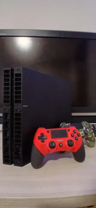 Consola PlayStation 4 en color negro. Incluye dos mandos, uno rojo y otro de camuflaje. - Consola PS4. - Mando DualShock 4 rojo. - Mando DualShock 4 camuflaje. - actualización 13.02 - viene con un juego incluido - 500gb - la vendo por aver comprado la ps5 esta perfecta - se aceptan cambios!!
