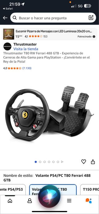Volante de carreras Thrustmaster T80 Ferrari 488 GTB. - Diseño inspirado en el Ferrari 488 GTB. - Compatible con PlayStation 4 y PC. - Pedales incluidos.