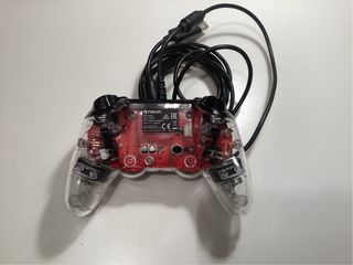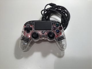 Mando de consola compatible con PS4 y PS5. Su diseño transparente permite ver los componentes internos. - Conexión por cable. - Botones de acción con símbolos. - Cruzeta direccional.