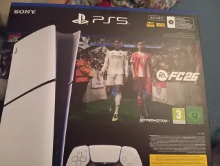 Nueva, sin ab4ir, fue regalo cumpleaños y tengo 2. Consola PlayStation 5 Slim Edición Digital con el juego EA Sports FC 26. - Capacidad de 825 GB. - Soporte para 4K y 120 Hz. - Tecnología HDR. - Incluye el juego EA Sports FC 26.