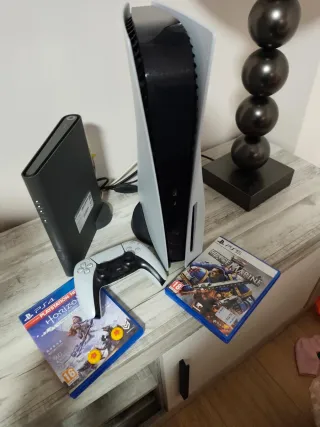 Consola PlayStation 5 en color blanco, modelo Fat. - Incluye mando DualSense. - Juego Horizon Zero Down (PS4). Compatible con PS5 - Juego Warhammer 40,000: Space Marine (PS5). - Protectorea para joystick de Dragón Ball Se puede probar sin compromiso. A pesar de ser el primer modelo, tiene muy poco uso, motivo por el cual se vende