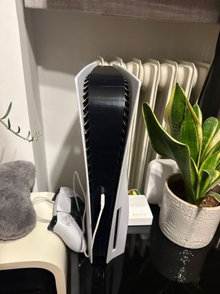 Soporte vertical para PlayStation 5 en buen estado. Incluye base de carga para dos mandos. - Permite carga simultánea de dos mandos. - Diseño elegante y compacto. - Perfecto para organizar tu PS5 y mandos.