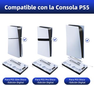 Nuevo!! Fotos reales al final. Este soporte de refrigeración multifuncional es compatible tanto con la PS5/PS5 Slim/PS5 Pro UHD/Digital Edition. Equipado con un ventilador turbo integrado con 3 velocidades ajustables (alta, media y baja), con velocidades de 4000/3500/3000 RPM. Base de carga para dos mandos de forma simultánea. Incluye un gancho para los auriculares y un espacio para guardar el mando a distancia. Incluye 3 concentradores USB. Este soporte admite la carga en modo de reposo. Para habilitar esta función, configure los puertos USB de su consola PS5 para que suministren energía siempre. E6W
