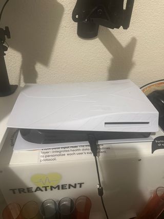 Consola de videojuegos de última generación con un diseño moderno y elegante. - Color blanco. - Modelo PlayStation 5. Aparcada por no usar con mando y caja cables y soporte