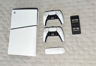 Consola en perfecto estado con 1Tb sin lector de discos - Incluye dos mandos DualSense. - Base de carga para mandos. - Mando a distancia multimedia. -Incluye cable de alimentacion y HDMI. PRECIO NO NEGOCIABLE. ACEPTO CAMBIO POR ALGO QUE ME INTERESE.