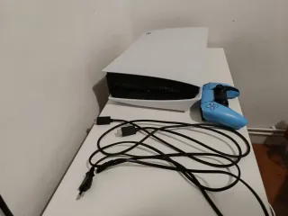 Consola PlayStation 5 con lector de discos y mando - SSD M.2 de 2 TB instalado (almacenamiento ampliado) - 1 mando original color celeste - Cables originales de la consola (no incluye cable USB-C para cargar el mando) Todo funcionando correctamente - Opción de venta sin el SSD M.2 (solo la PS5 con su almacenamiento interno). Pregunta sin compromiso No cambios.