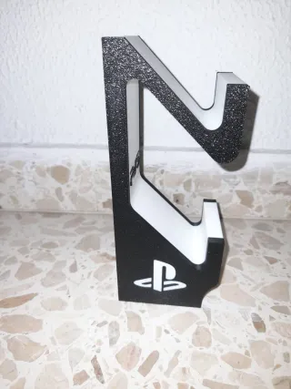 Soporte diseñado para mandos de PlayStation 5. Presenta un acabado texturizado en negro brillante y detalles en blanco. - Diseño moderno y funcional. - Logo de PlayStation visible.
