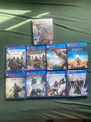 Lote de videojuegos de la saga Assassin's Creed para PlayStation 4. AC 3 Y Rogue CARATULA EN INGLES, JUEGO EN ESPAÑOL - Assassin's Creed Mirage (PS5) - Assassin's Creed Unity - Assassin's Creed Syndicate - Assassin's Creed Odyssey (Edición Omega) - Assassin's Creed Origins (Edición Deluxe) - Assassin's Creed The Ezio Collection - Assassin's Creed III Remastered - Assassin's Creed IV Black Flag - Assassin's Creed Rogue Remastered Todos en perfecto estado Entrega en mano en Gran Canaria