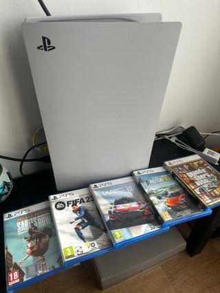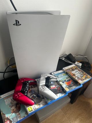 - Consola PlayStation 5. - Mando DualSense rojo. - Mando DualSense blanco. - Juego: Grand Theft Auto V. - Juego: The Crew Motorfest. - Juego: FIFA 23. - Juego: Saint Row.