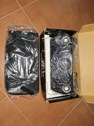 Sistema de sonido para PSP. Incluye funda protectora. - Altavoces negros. - Funda de tela negra.