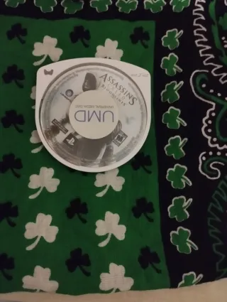 Videojuego Assassin's Creed Bloodlines para PSP. El disco está en buen estado y se lee perfecto. El manual se mojó, no se pueden separar las páginas. La caja y la carátula no son originales. La caja está rota.