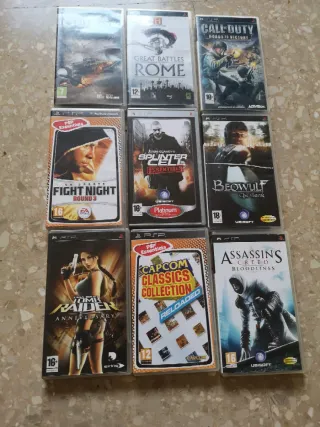 Colección de 9 videojuegos para PSP, con una variedad de géneros para disfrutar. - Gran Turismo - Great Battles: Rome - Call of Duty: Roads to Victory - Fight Night Round 3 - Splinter Cell Essentials - Beowulf: The Game - Tomb Raider: Anniversary - Capcom Classics Collection Reloaded - Assassin's Creed: Bloodlines