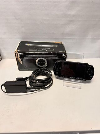 Consola portátil Sony PSP 3000 en color negro. Incluye: - 1 consola con protector - 2 baterías nuevas - 1 recambio de tapa y joystick - 1 tarjeta de memoria (4gb) - 1 cargador (5v) - 3 fundas y 1 portajuegos - 4 juegos y 2 películas con caratulas. Tiene algún desgaste en la pintura y ralladuras.