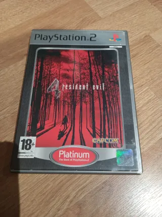 Videojuego Resident Evil 4 para PlayStation 2, edición Platinum. - Juego de terror y supervivencia. - Carátula con diseño de bosque rojo. - Clasificación PEGI 18+.