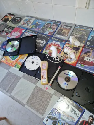 Amplia colección de videojuegos para consolas PlayStation 2 y PlayStation 4. Incluye títulos variados para todos los gustos. - Juegos de PS2: Call of Duty, PES 2000, Singstar (varios títulos), Buzz! (varios títulos), Formula One 2003, FIFA 09, y más. - Juegos de PS4: FIFA 20. - Incluye también juegos de Wii como Link's Awakening. - Se incluyen discos de juegos y sus carátulas.