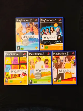 Lote de cinco juegos de karaoke para PlayStation 2. Todos con manuales,menos el SingStar normal,en condiciones aceptables (comprobados y funcionales).los 5 juegos por 5.90 euros y te regalo el SingStar pop que viene en la carátula del SingStar ot. - Singstar - Singstar Pop Hits - Singstar Summer Party - Singstar (otro título no visible) - Singstar (otro título no visible)