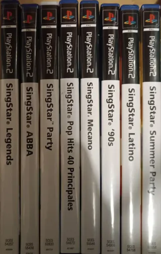 Lote de 8 videojuegos SingStar para PlayStation 2. - SingStar® Legends - SingStar® ABBA - SingStar™ Party - SingStar® Pop Hits 40 Principales - SingStar. Mecano - SingStar® '90s - SingStar® Latino - SingStar® Summer Party Posibilidad de incluir una ps slim por 40€ más, microfonos 5€