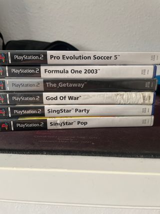 Lote de seis videojuegos para PlayStation 2. - Pro Evolution Soccer 5 - Formula One 2003 - The Getaway - God Of War - SingStar Party - SingStar Pop juegos muy icónicos