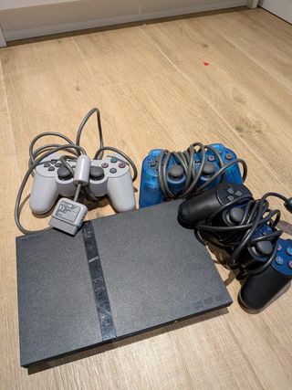 Consola Playstation 2 en color negro, junto con tres mandos para disfrutar de tus juegos. - Consola Playstation 2. - Mando gris. - Mando azul translúcido. - Mando negro. - Micrófonos Singstar - 5 juegos - Hay que repararla
