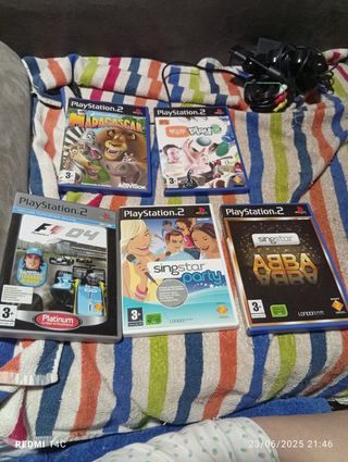 ✅ Consola PS2 Slim moderna. ✅ Mando original Sony. ✅ 11 juegos que funcionan correctamente. (algunos con leves rayas, otros en excelente estado; incluye los SingStar) 🕹️ El juego Space Jam se entrega sin su caja original. 📦 Algunas cajas son de segunda mano (de Game), otras son originales y en muy buen estado. ✅ 5 micrófonos SingStar + 2 adaptadores para poder jugar 4 personas a la vez. ✅ Memory Card de 8 MB original. ✅ Cables de corriente y vídeo incluidos. ✅ Adaptador de vídeo AV. 🧩 Todo probado y funcionando correctamente. Entrega en mano o envío.