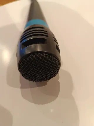 Micrófono con cable de color azul. - Diseño ergonómico. - Conector de audio. - Ideal para karaoke. - Tiene un pequeño hoyo en la rejilla, pero funciona perfectamente.