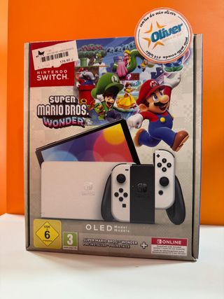 Consola Nintendo Switch OLED en color blanco, a estrenar. Incluye el juego Super Mario Bros. Wonder preinstalado. - Modelo OLED con pantalla vibrante. - Joy-Con en blanco y negro. - Juego Super Mario Bros. Wonder preinstalado.