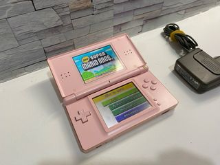 Consola portátil Nintendo DS Lite en color rosa. Incluye el juego New Super Mario Bros.. PRECIO NO NEGOCIABLE - Pantalla superior con el juego New Super Mario Bros.. - Pantalla táctil inferior con menú de juego. - Cargador incluido.