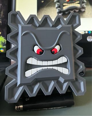 Esta caja decorativa está inspirada en el personaje Thwomp de Super Mario Bros. Su diseño robusto y detallado la hace destacar. - Fabricada en plástico gris. - Detalles faciales en relieve. - Tapa superior con diseño dentado.
