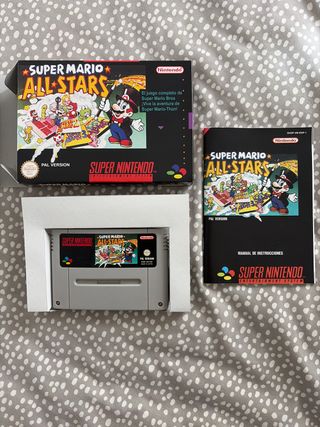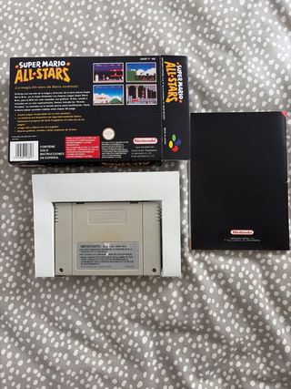 Juego Super Mario All-Stars para Super Nintendo (SNES). Versión PAL. - Incluye caja de reproducción. - Insert de reproducción. - Manual español de reproducción. - Cartucho original PAL ESP. - El cartucho contiene Super Mario Bros., Super Mario Bros. 2, Super Mario Bros. 3 y Super Mario World.