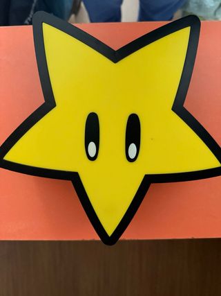 Figura decorativa de la icónica estrella de Super Mario Bros. - Diseño amarillo brillante con contorno negro. - Ojos negros y blancos característicos.